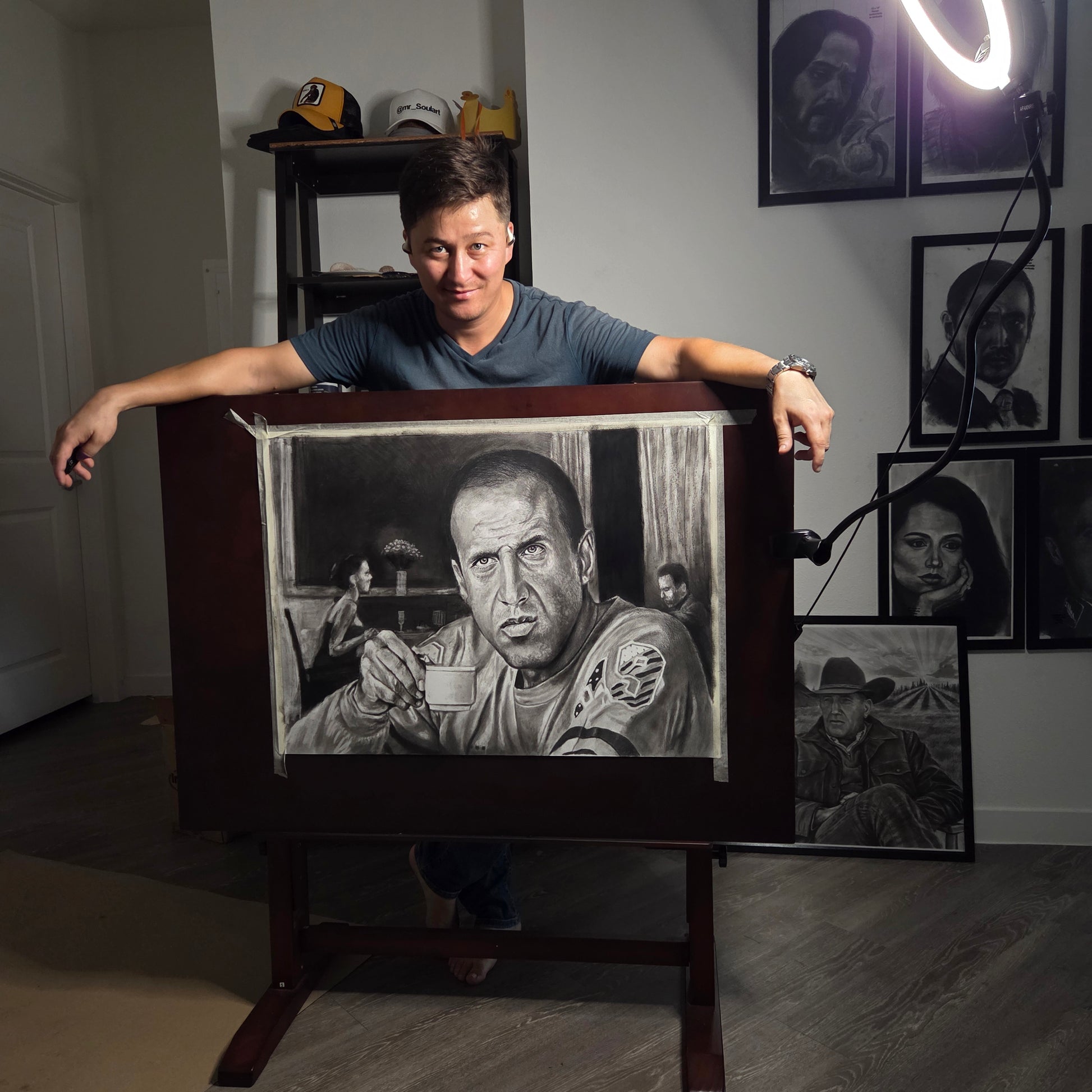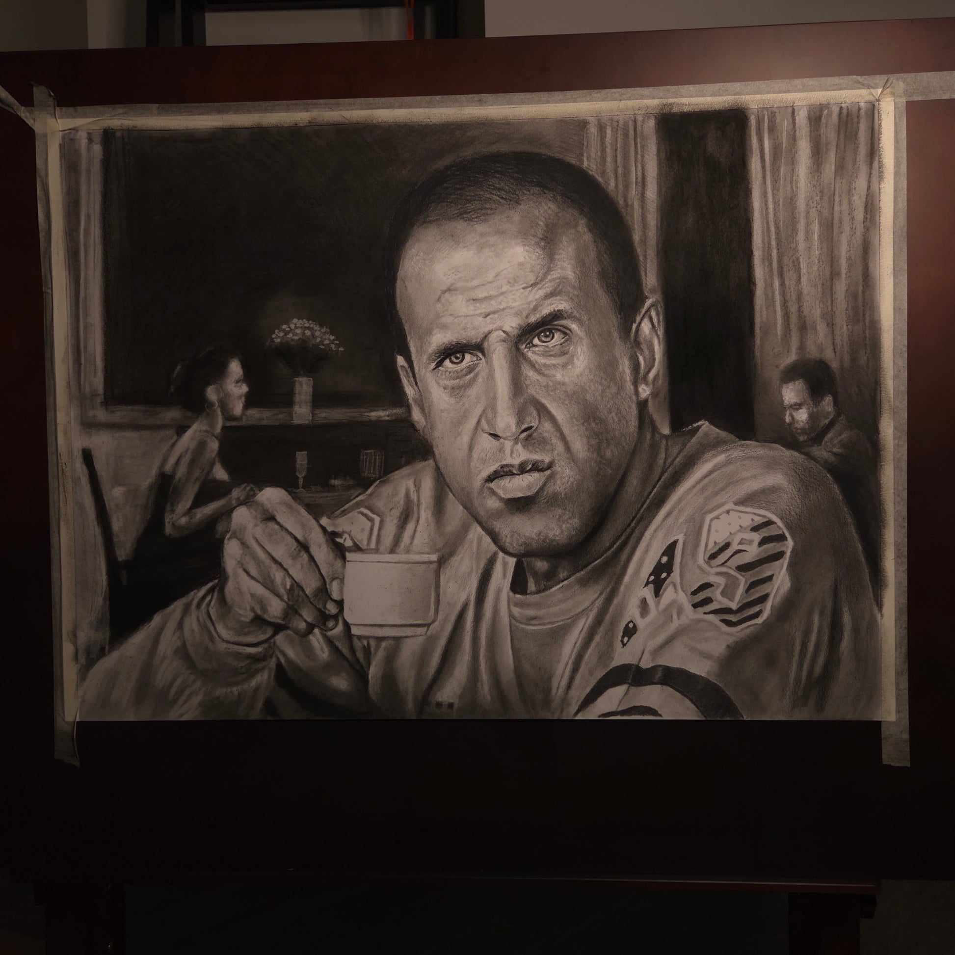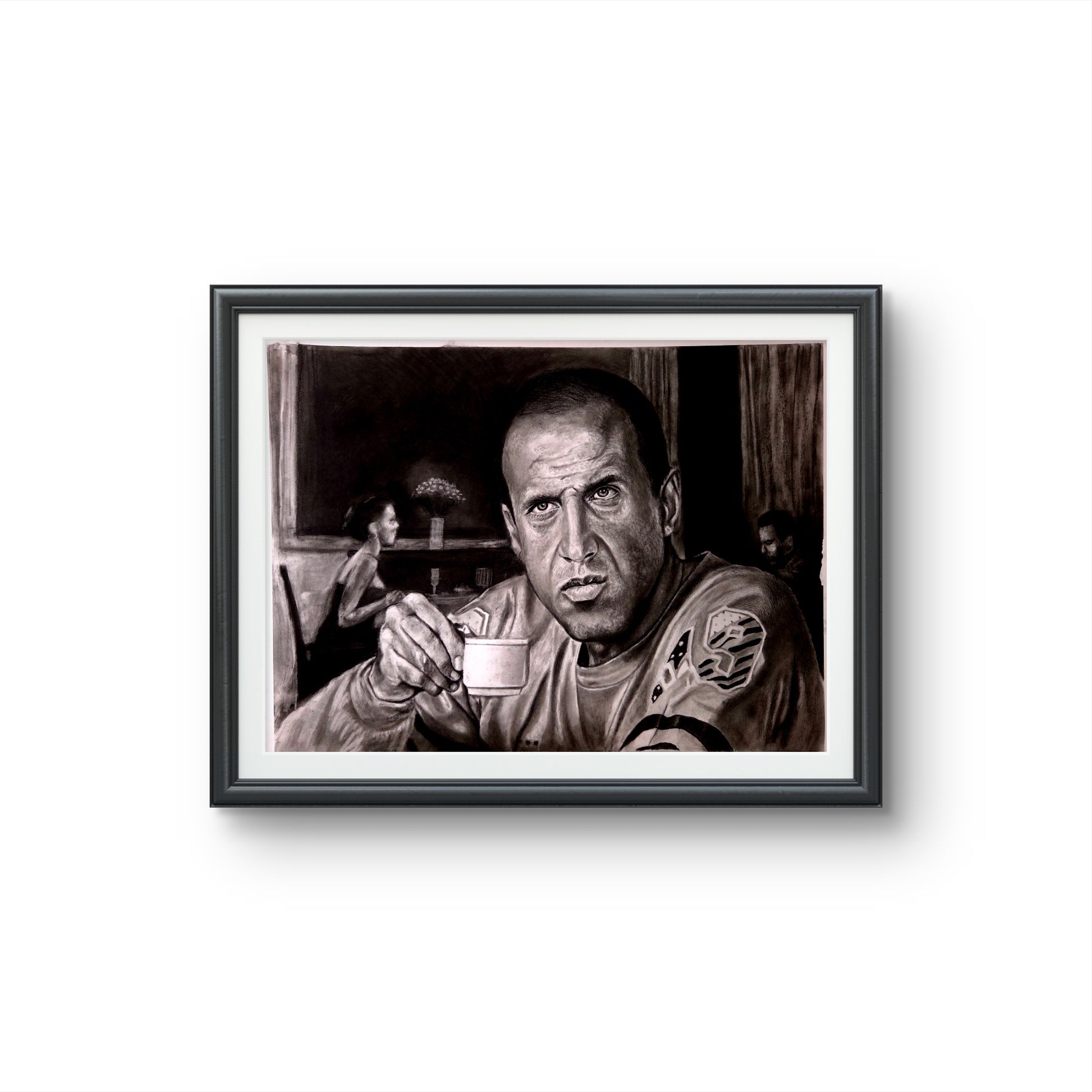 Drawn in charcoal by Azat Bizhan, this artwork captures a striking moment — Celentano holding a cup of espresso, his intense gaze full of both defiance and thought. The cinematic composition, with its soft background details and bold contrasts, echoes the golden age of Italian cinema and music. A perfect piece for admirers of Celentano, lovers of European culture, and fine art collectors.