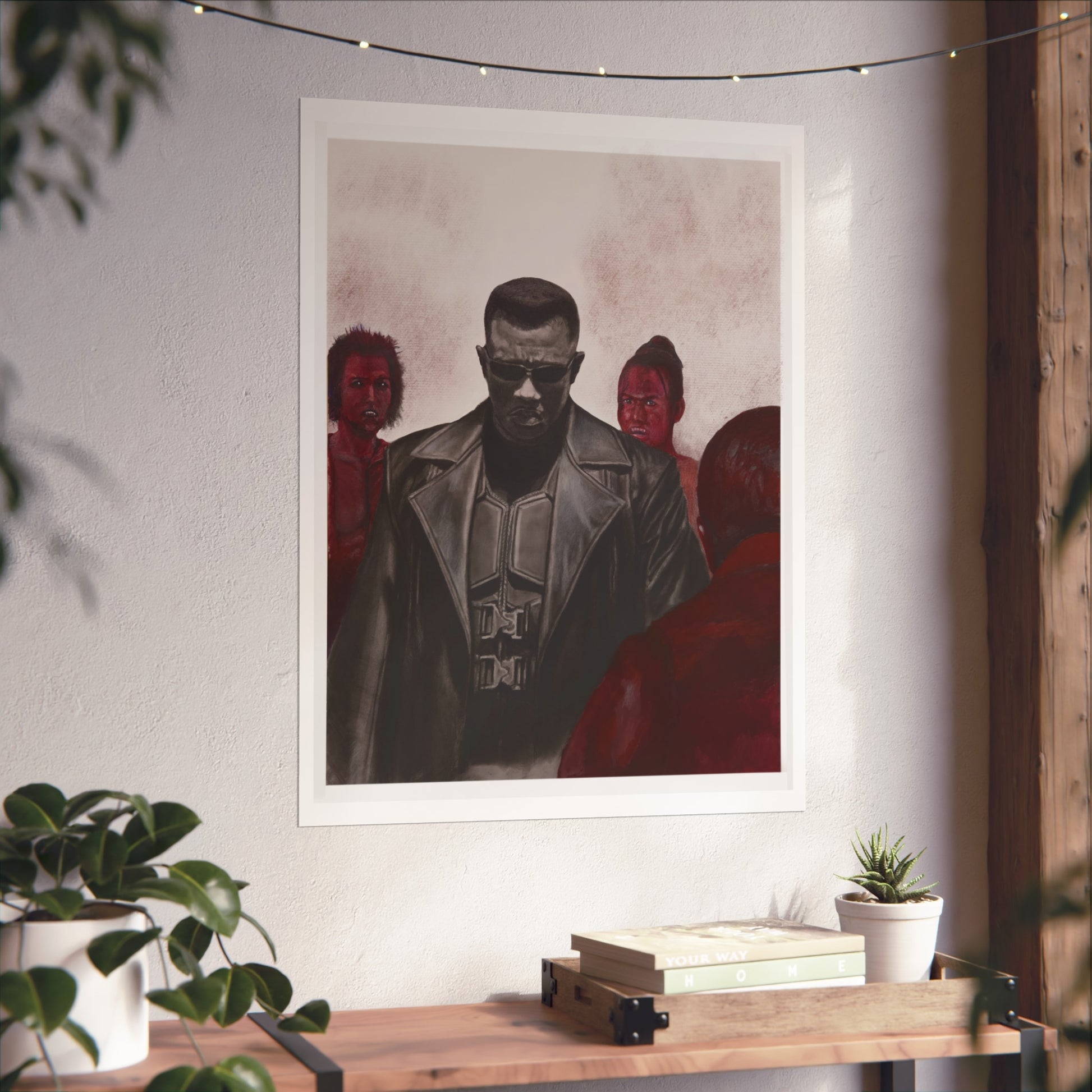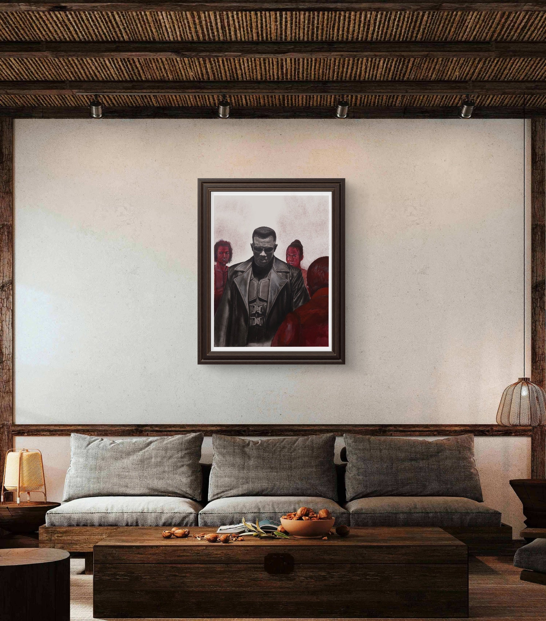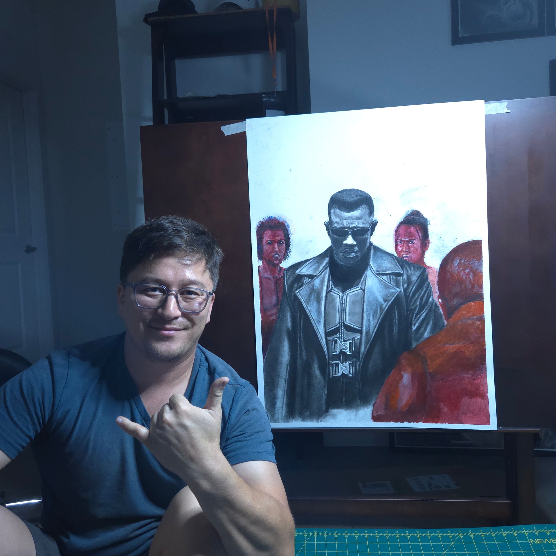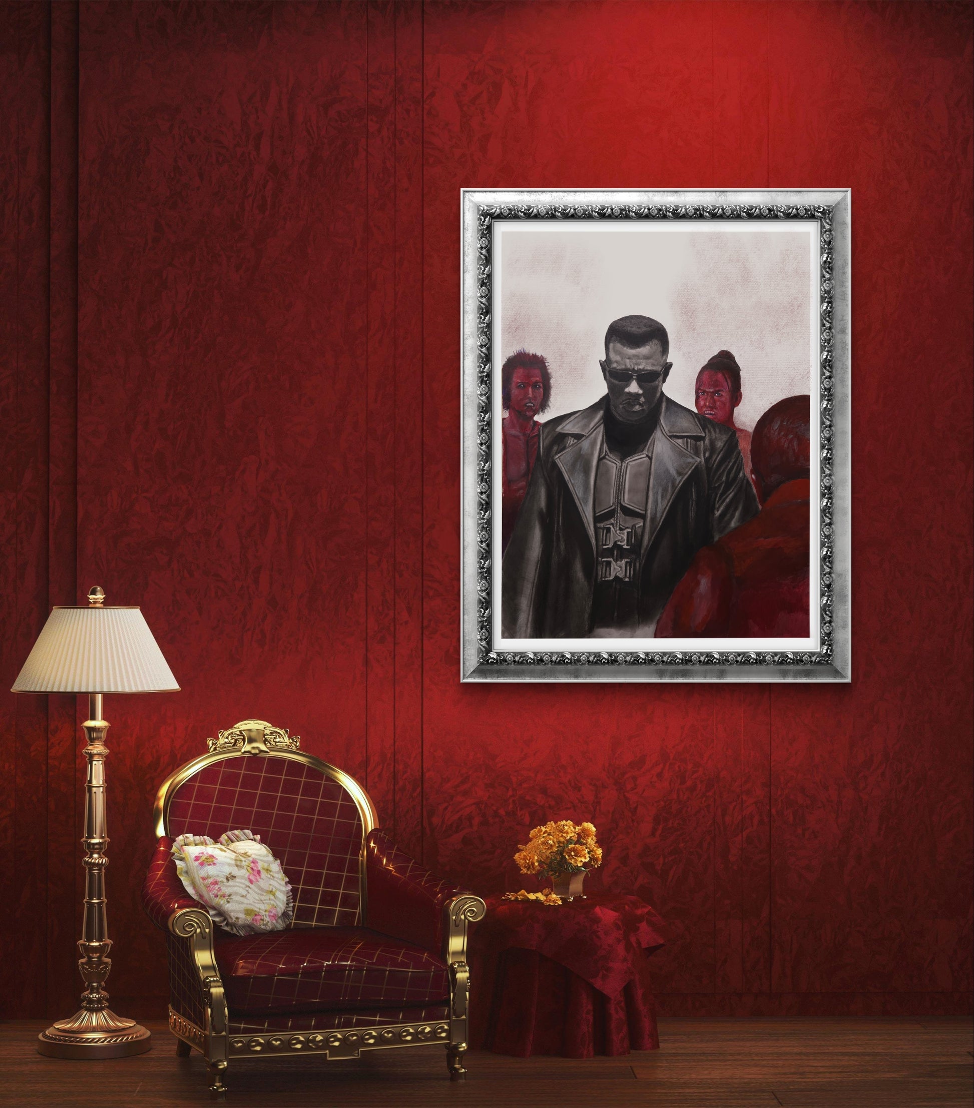 Meticulously rendered in charcoal and pencil, this piece captures Blade’s iconic presence — from the glint of his tactical gear to the intensity in his stance. The surrounding vampire figures are brought to life with bold contrasts and rich tones, amplifying the tension of the scene.
