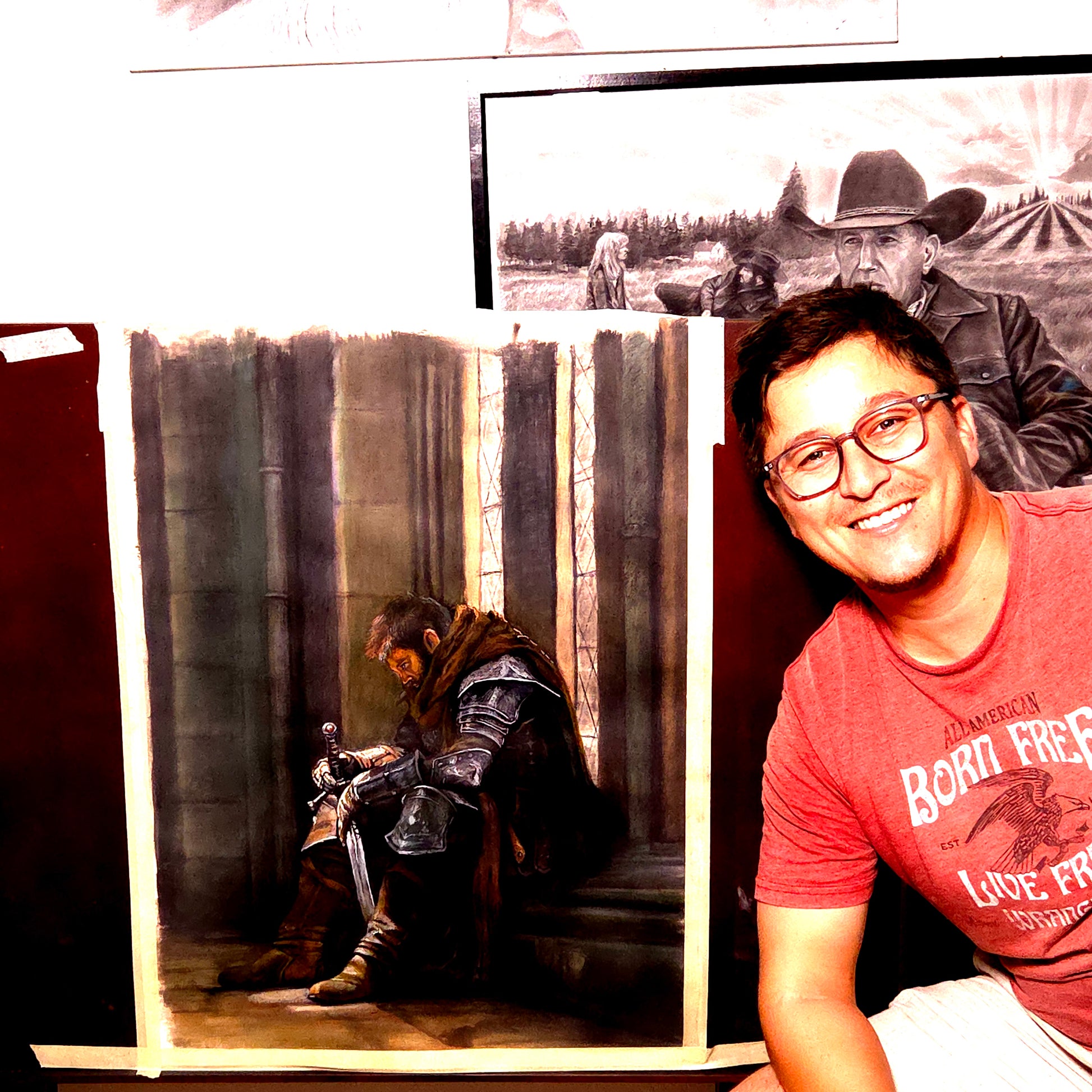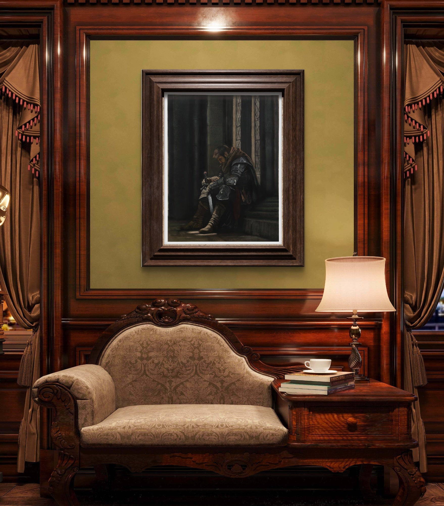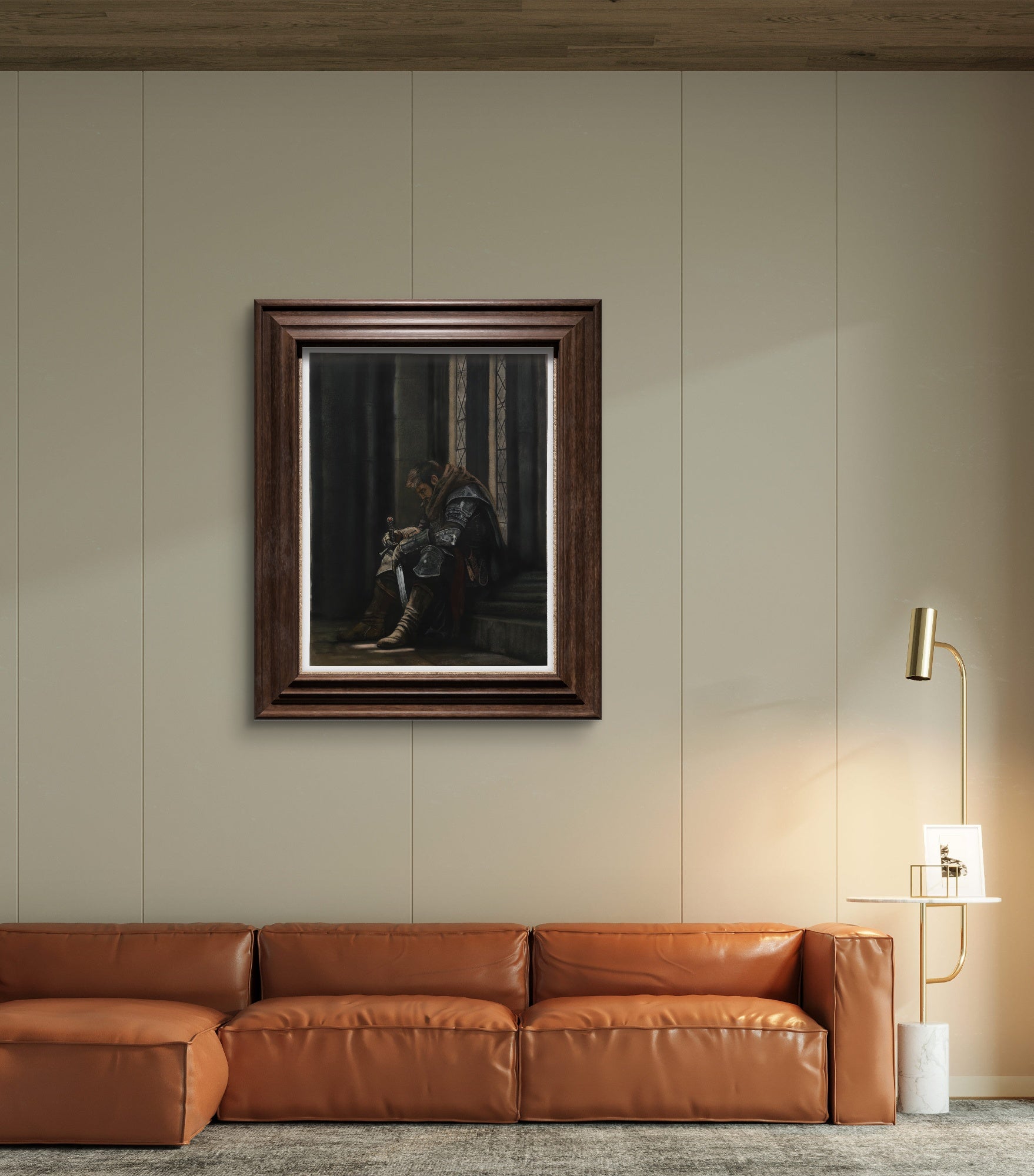 Step into the solemn world of medieval honor with this powerful fine art print, portraying a knight in a rare moment of silence before the storm of battle.